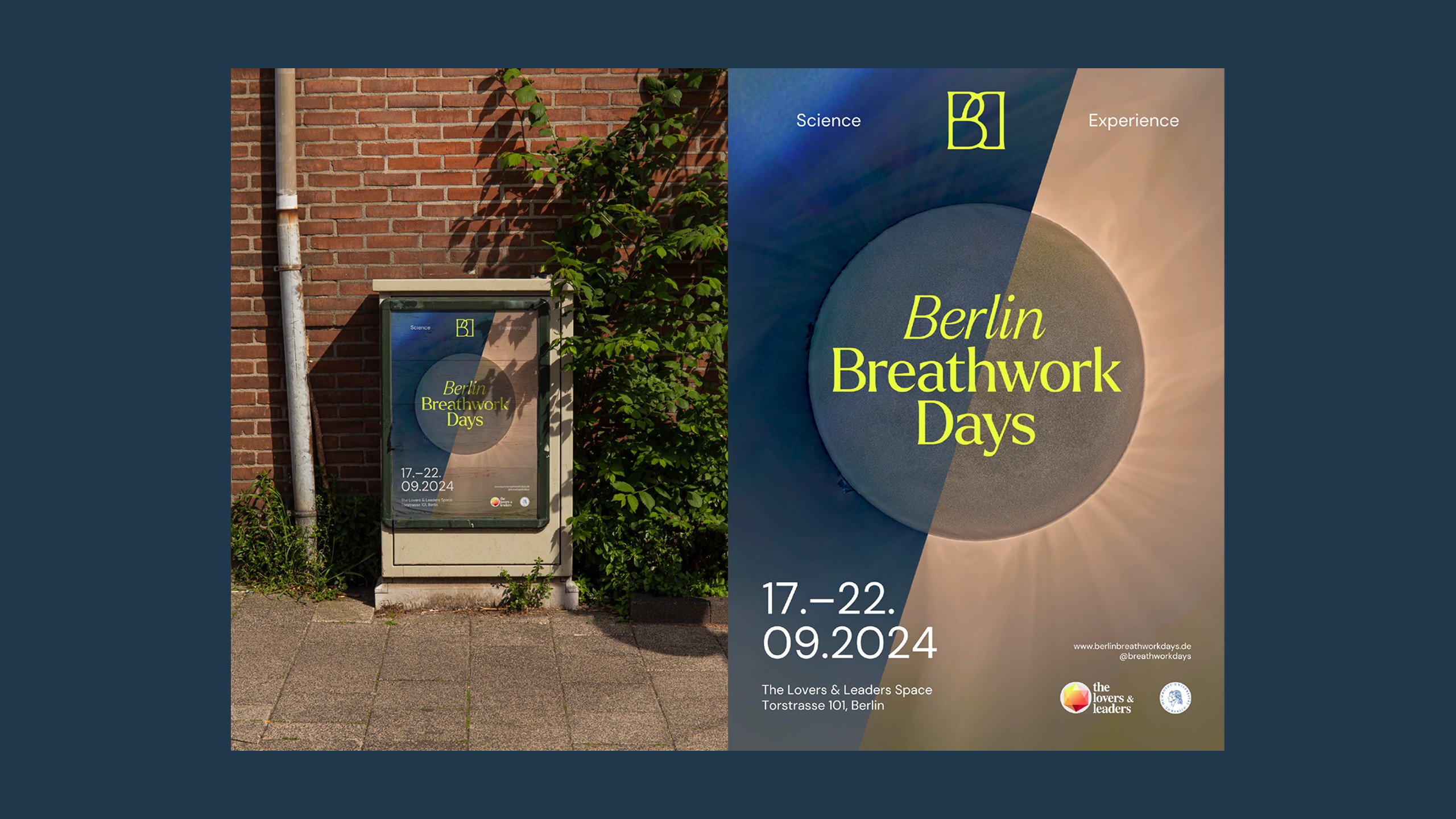 Berlin Breathwork Days is a multi-day gathering of scientist, researchers, breathwork facilitators, practitioners, and enthusiasts initiated by Yasmine Orth from The Lovers & Leaders and Humboldt University of Berlin in 2024. I helped create a conference identity, social media graphics, and print materials. The identity draws from the two opposite poles science and experience which are brought together through this event.