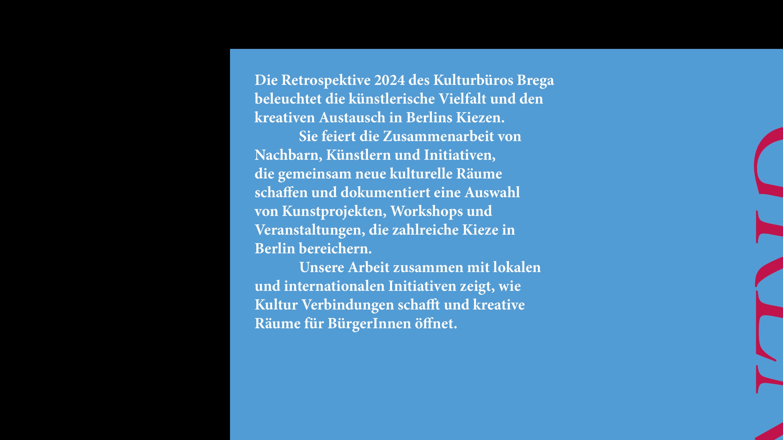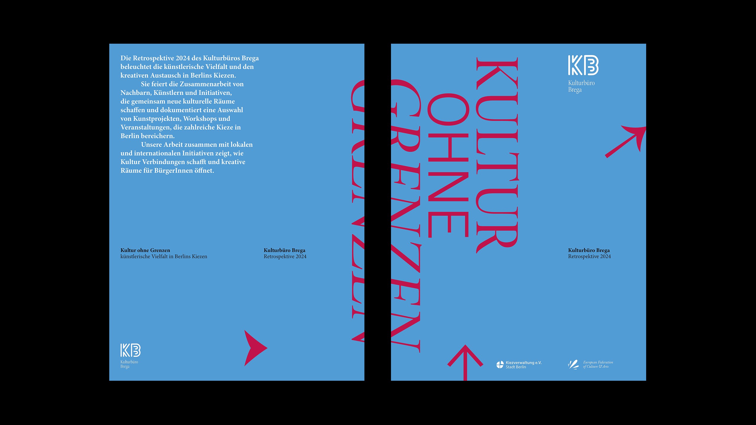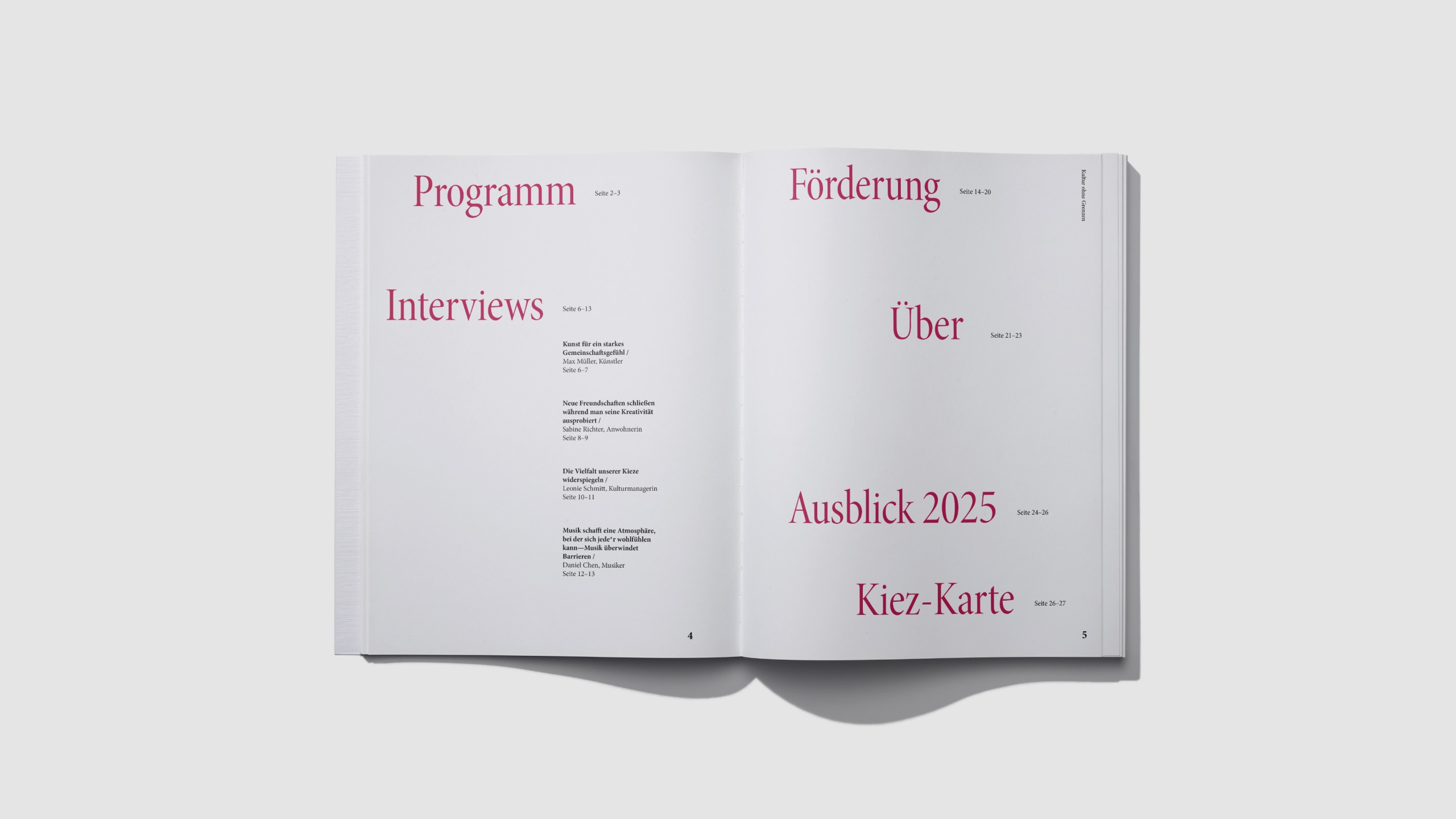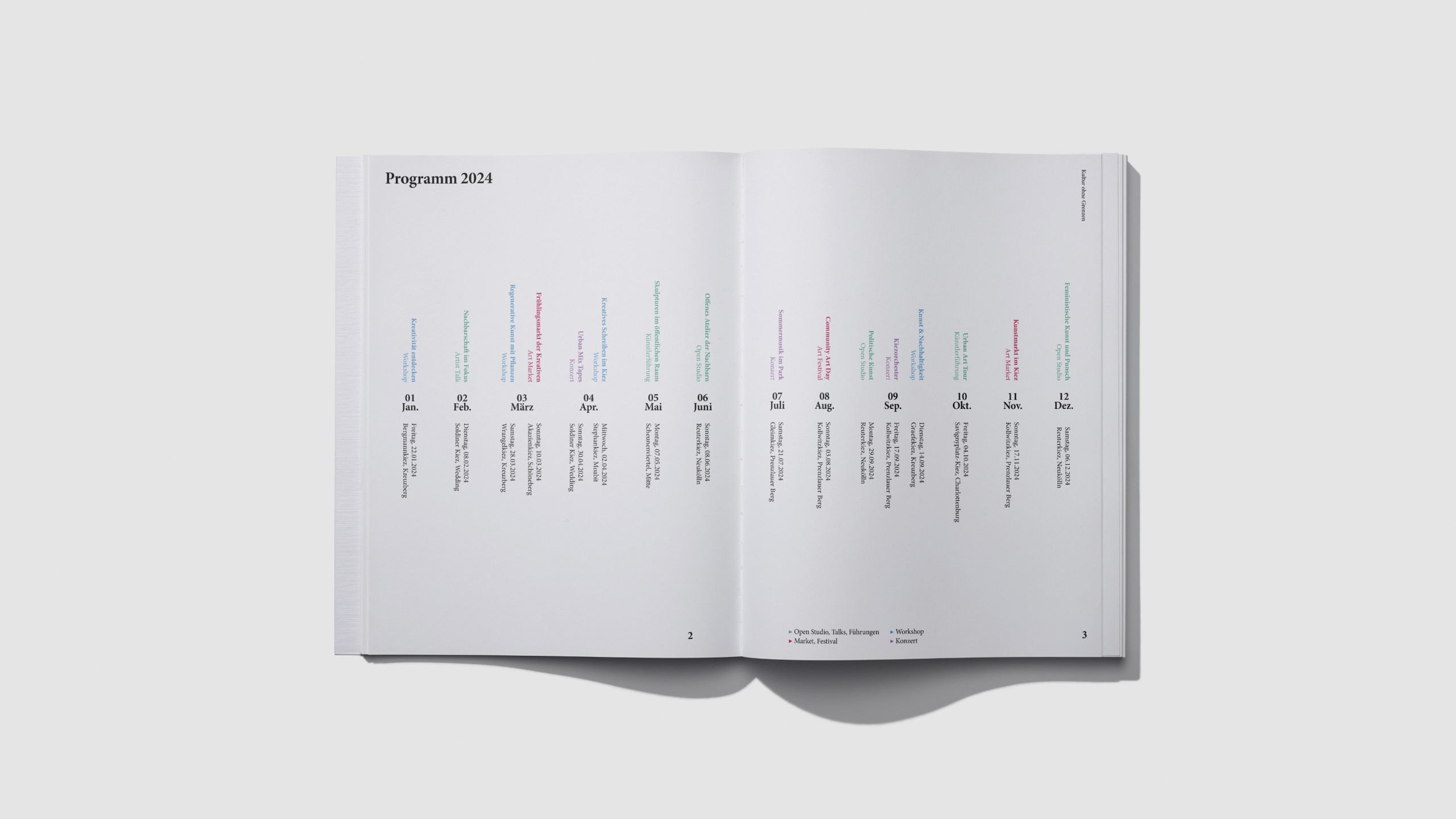I created the print publication “Kultur ohne Grenzen”, a retrospective of cultural diversity and exchange in Berlin. It’s a guide to local art and culture, highlighting how it brings together the public and creates connections based on creativity.